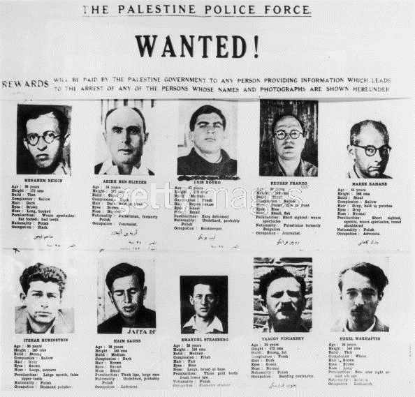 Cartaz de caça aos “terroristas” que a 22/07/1946 explodiram com bomba o hotel Rei David, quartel-general do governo britânico em Jerusalém, matando ao menos 91 pessoas; os “procurados” depois se tornaram os maiores líderes da constituição do Estado de Israel em 1948