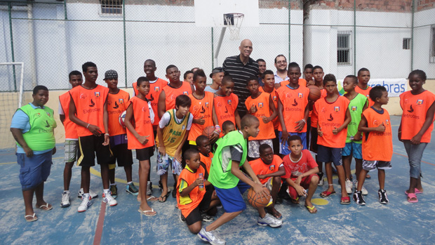 Kareem Abdul-Jabbar, maior pontuador da liga nacional de basquete dos Estados Unidos da América, em visita à quadra de esportes do Calabar com time de basquetebol da comunidade [foto: Eric Luiz Carvalho, 2012]