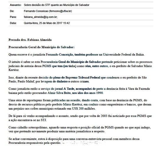 Em maio deste 2017, com a condenação de Maluf, como simples cidadão soteropolitano indaguei à chefia da PGMS se o exemplo não poderia ser aplicado a Salvador.