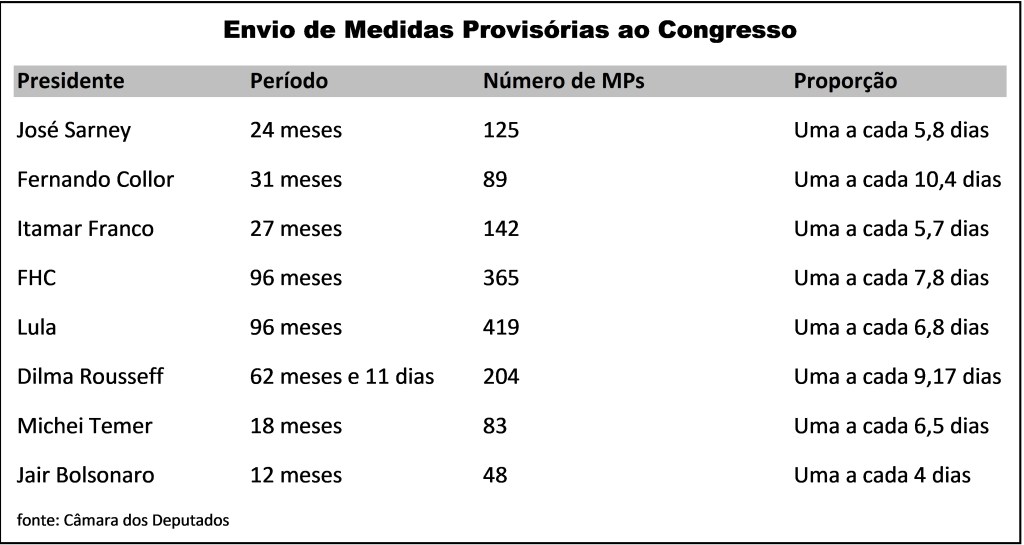 MP é expediente previsto no artigo 62 da Constituição Federal em vigor desde outubro de 1988. Todos os presidentes a partir de então a tem utilizado, nem sempre respeitando os estritos princípios de “relevância e urgência” ali recomendados.