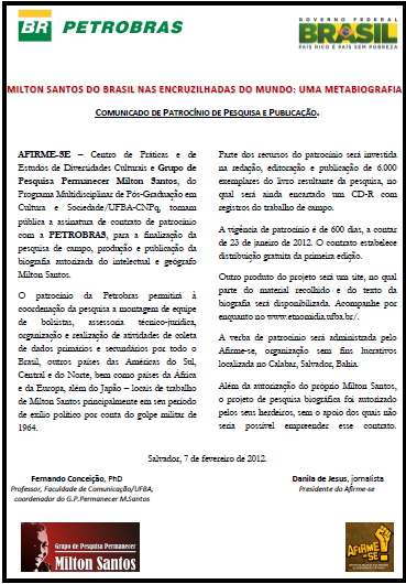 A Petrobras patrocinou com R$ 500 mil a finalização da pesquisa, produção e publicação de Milton Santos, uma biografia, lançada em dezembro de 2015. Veja um sample clicando aqui.
