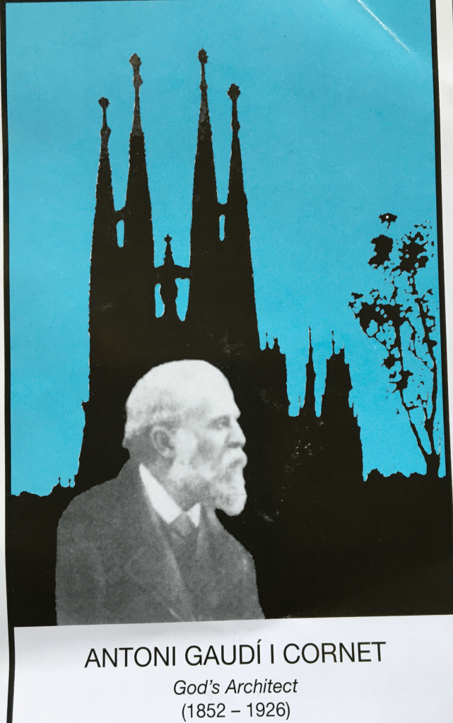 Voltou encantada com a genialidade de Gaudí, arquiteto que projetou a Catedral da Sagrada Família na capital catalã. De chegada presenteou-me com um caderninho de notas: capa e contracapa reproduzindo obras de Gaudí (1852-1926). Passados cinco dias de seu retorno, essa manhã deu-me um cartão postal com o retrato do arquiteto, por trás a sombra de sua magna obra em Barcelona.