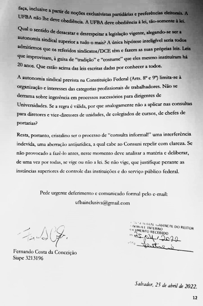 Petição de 12 páginas protocolada na manhã deste 25/04/2022 no Gabinete da Reitoria em Salvador, instruída com documentos, pede ao reitor João Carlos Salles Pires que convoque imediatamente reunião extraordinária do Conselho Universitário (Consuni), instância máxima da instituição, para examinar a matéria.