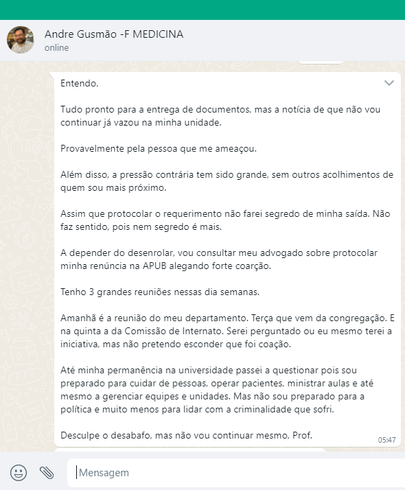 “Assusta!”, disse André Gusmão, abalado, em outra mensagem, admitindo ter pensado que a disputa para o Reitorado seria limpa e civilizada.