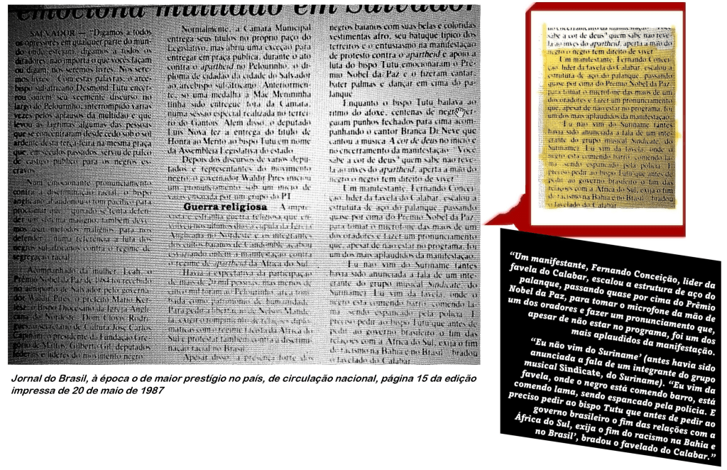“Um manifestante, Fernando Conceição, líder da favela do Calabar, escalou a estrutura de aço do palanque, passando quase por cima do Prêmio Nobel da Paz, para tomar o microfone da mão de um dos oradores e fazer um pronunciamento que, apesar de não estar no programa, foi um dos mais aplaudidos da manifestação”, escreveu o Jornal do Brasil.
